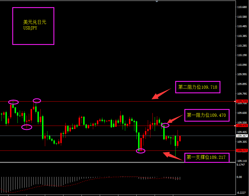 策略分析:第一支撑附近看多至109.718附近,期间大阴线跌破第一支撑位则观望。