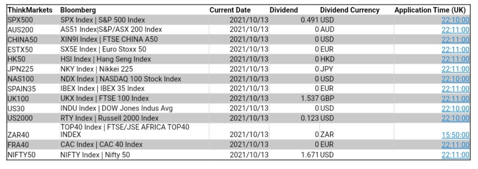 ThinkMarkets智汇平台CFD股指10月13日股息结算明细
