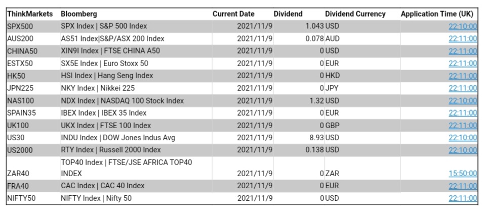 ThinkMarkets智汇平台CFD股指11月9日股息结算明细