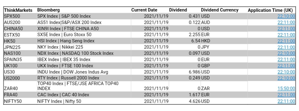 ThinkMarkets智汇平台CFD股指11月19日股息结算明细