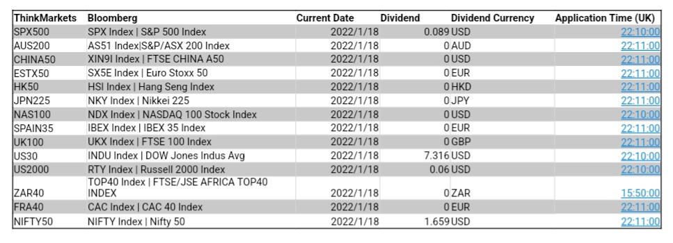 ThinkMarkets 1月18日股指股息结算明细