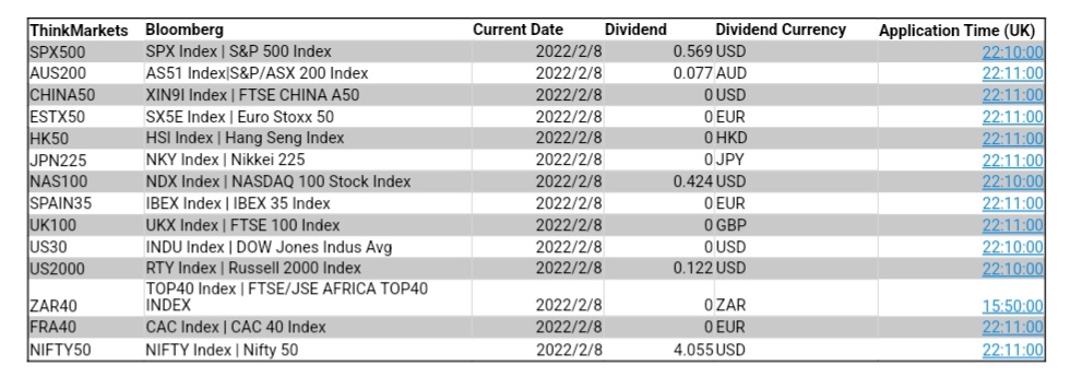 ThinkMarkets智汇平台CFD股指2月8日股息结算明细