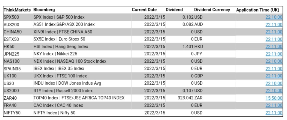 ThinkMarkets 3月15日股指股息结算明细