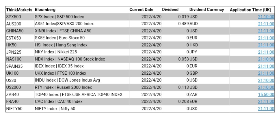 ThinkMarkets 4月20日股指股息结算明细