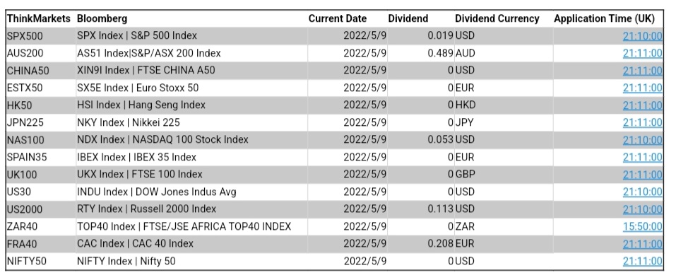 ThinkMarkets 5月9日股指股息结算明细