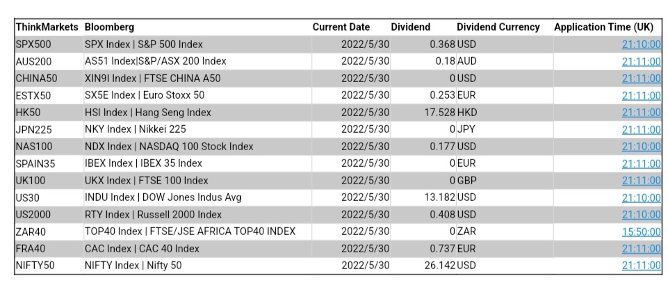 ThinkMarkets智汇平台CFD股指5月30日股息结算明细
