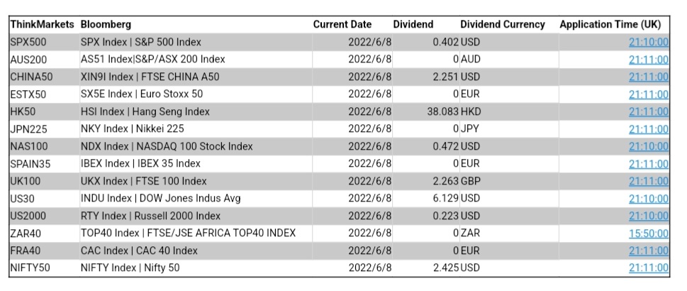 ThinkMarkets智汇平台CFD股指6月8日股息结算明细