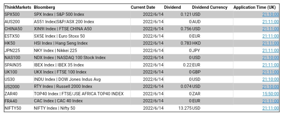 ThinkMarkets智汇平台CFD股指6月14日股息结算明细
