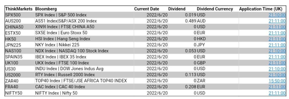 ThinkMarkets 6月20日股指股息结算明细