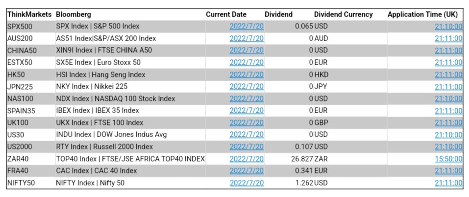 ThinkMarkets智汇平台CFD股指7月20日股息结算明细