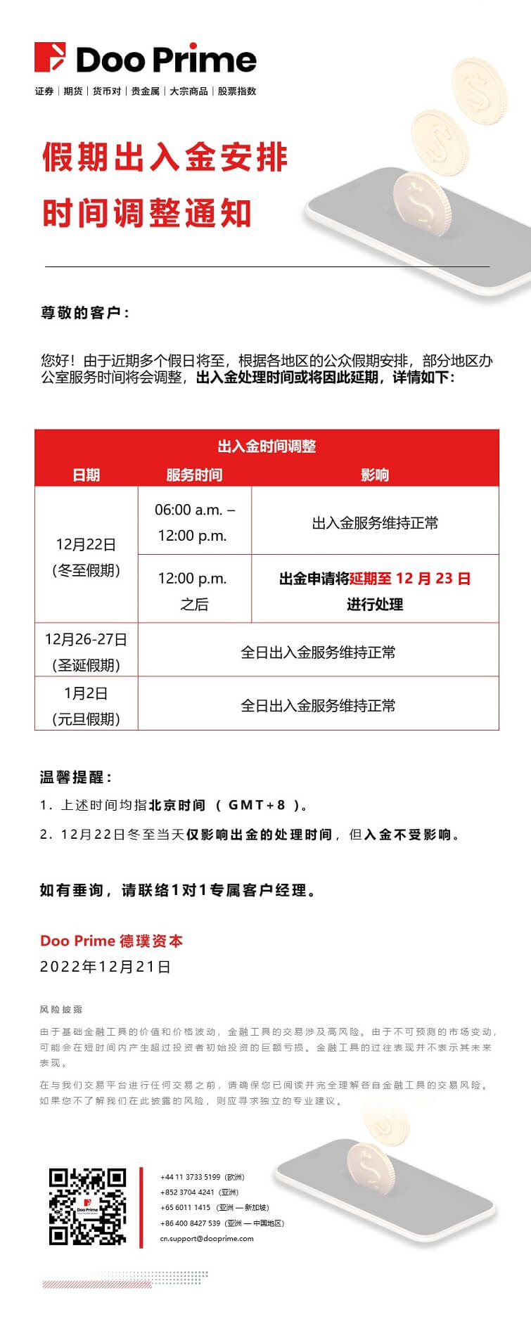 Doo Prime 假期出入金时间调整通知