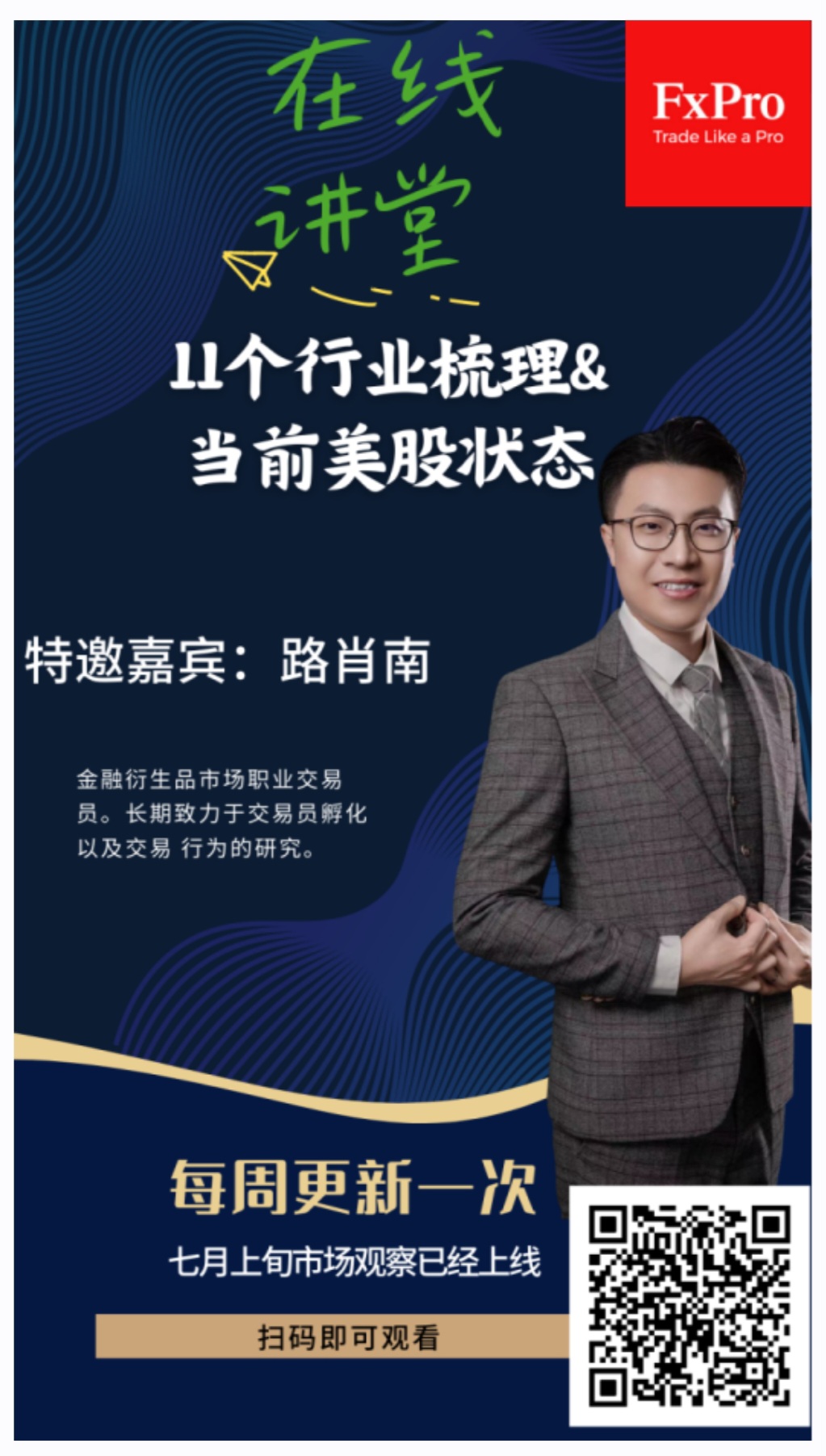 FxPro特邀嘉宾路肖南录播的七月上旬市场观察将分两期播放,本期为第二期,主要梳理11个行业,大致的浏览一下每一个该怎样去应对以及这里面现在美股状态。扫码即可观看。